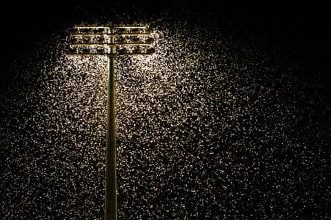Thousands of moths swarm around floodlights. Artificial light at night can affect every aspect of insects’ lives, the researchers said. Photograph: Simone De Peak/Getty Images